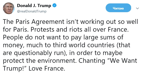 «Парижское соглашение не очень хорошо работает для Парижа. Протесты и беспорядки по всей Франции. Люди не хотят платить большие деньги, в основном, странам третьего мира, на якобы защиту окружающей среды. Они скандируют „Мы хотим Трампа!“ Люблю Францию», — написал американский лидер в своем микроблоге в Twitter.