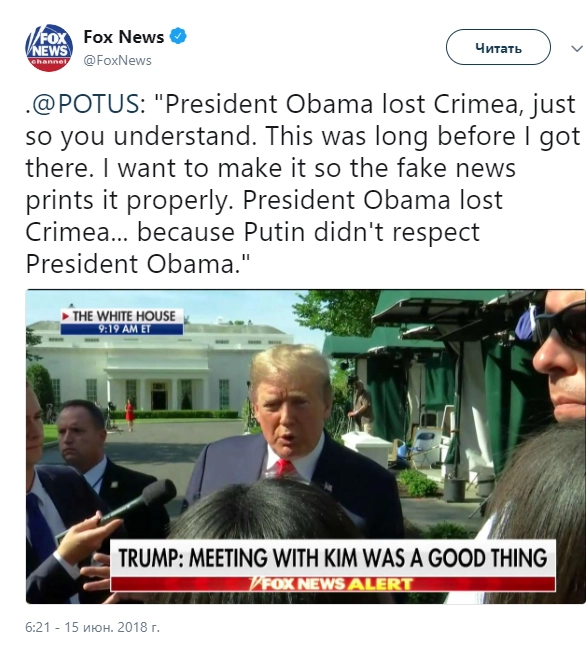 «Президент Обама потерял Крым, как вы понимаете. Это было задолго до меня. Президент Обама потерял Крым… потому что Путин не уважал президента Обаму», — приводит телеканал Fox News слова Трампа.