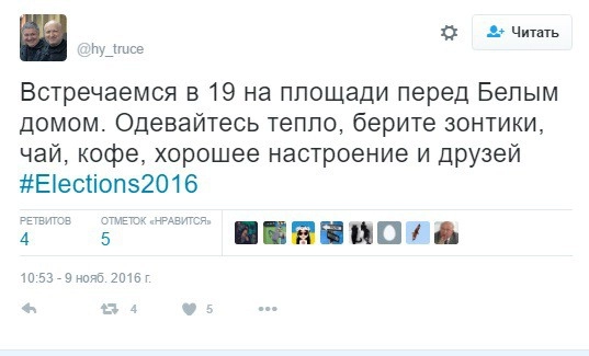 Шутки вообще конек российских пользователей, особенно если они касаются США. Проигрыш Клинтон породил еще один повод для анекдотов — россияне ожидают, что теперь в Штатах начнется Майдан. Например, в российских сообществах распространяется пародия на пост Мустафы Найема, который он написал в 2014 году, организовывая украинскую революцию. Только теперь место встречи — Нью-Йорк или Вашингтон.