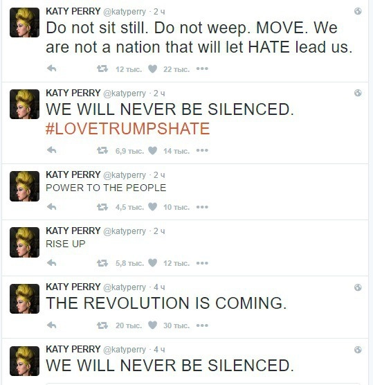 Другая ярая сторонница Клинтон — певица Мадонна. Во время президентской гонки она даже обещала оральный секс всем, кто проголосует за кандидата от Демократической партии. После объявления результатов, по всей видимости, Мадонна вздохнула с облегчением, однако приободрила своих подписчиков в Twitter: «Новый Огонь Горит. Мы Никогда Не Сдаемся. Мы Никогда Не Уступаем». Вскоре ее поддержала другая знаменитость — певица Кэти Перри: «Наступает революция! Мы никогда не будем молчать. Не сиди спокойно, не плачь, двигайся! Мы не та нация, которую ведёт ненависть», — написала она в своем микроблоге.