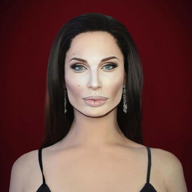 Да видно же что здесь не только макияж, но и много фотошопа. Не все похожи, а вот Анджелина Джоли как раз таки получилась похожа не на себя, а на Эвелину Бледанс, даже родинка там же)