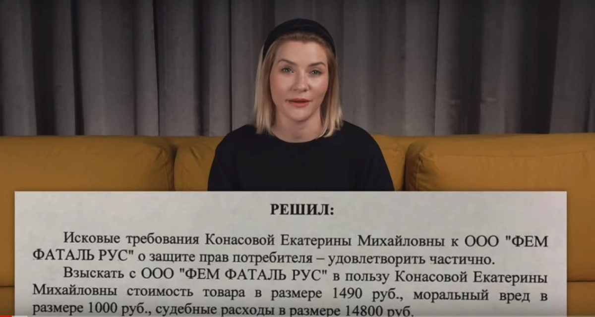 Сегодня Конасова объявила о том, что выиграла суд. Однако, как следует из ее ролика, суд постановил взыскать с ответчика только чуть больше 17 тысяч рублей — в эту стоимость включена цена товара, моральный вред и судебные издержки.