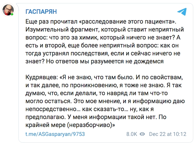 Публицист Армен Гаспарян удивился тому, что суперсекретный химик совершенно ничего об «отравлении» не знает — но каким-то способом отправился «устранять последствия».