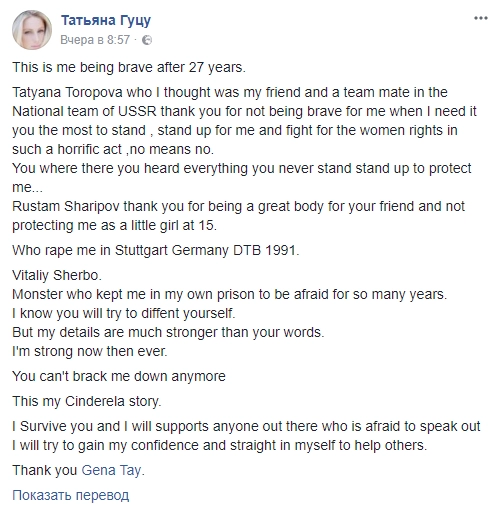 Ранее 41-летняя Татьяна Гуцу написала в Facebook, что в 1991 году ее изнасиловал Виталий Щербо. Спортсменка назвала его настоящим монстром.