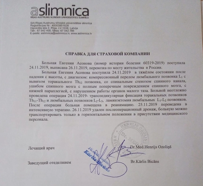 Евгения была госпитализирована, а 1 декабря ее перевели в Москву. У пострадавшей оказались сломаны два позвонка, также у нее диагностировали полное поперечное повреждение спинного мозга, нарушение работы органов малого таза и отсутствие чувствительности в ногах — спортсменка не может передвигаться сама.