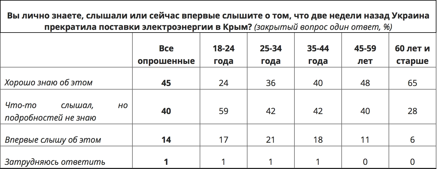 Прекращение подачи электроэнергии в Крым со стороны Украины стало значимым событием по всей России. Это отмечает подавляющее количество граждан страны — 85%. Среди москвичей и петербуржцев эта доля составляет 89%, среди пенсионеров — 93%. Только 14% респондентов заявили в ходе опроса, что слышат об энергетической блокаде впервые.