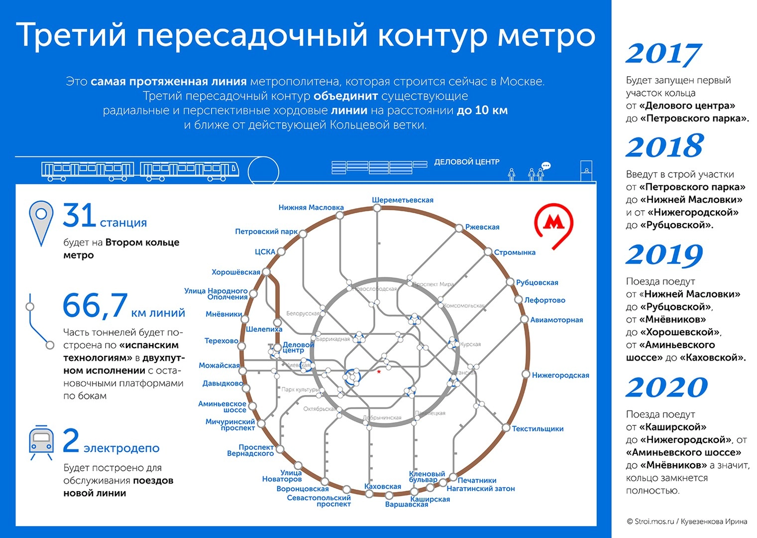 Через три года радиальные линии московского метро объединит ещё одно кольцо. Третий пересадочный контур (ТПК) станет самой протяженной кольцевой линией метро в мире, победив в этом негласном споре пекинскую подземку. Его протяженность составит почти семь десятков километров.