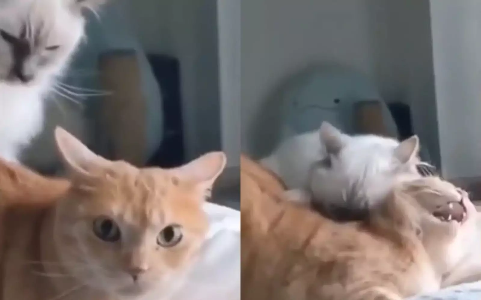 Хитрый котяра напал на брата сзади и показал ему мощнейший кусь. Второй пушистик явно ожидал подвоха, но не думал, что он будет таким серьезным. Ну просто настоящий кошачий триллер.