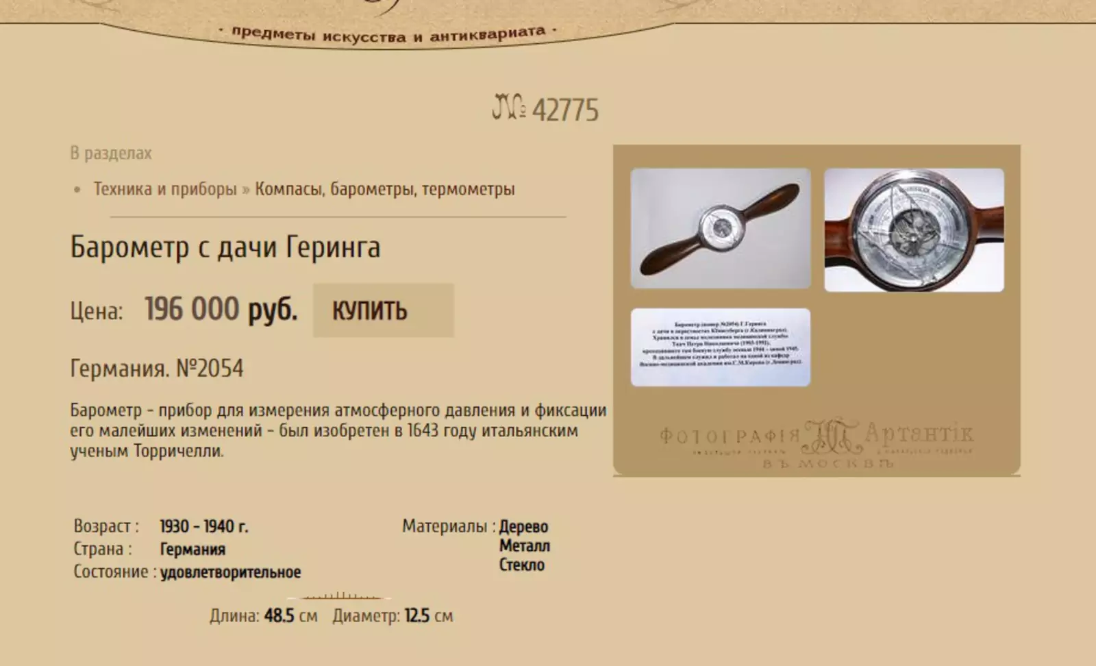 На «Авито» продавец запрашивает за барометр 325 тысяч рублей, указывая в описании, что такая цена «адекватная, и так занижена». Но в то же время на сайте по торговле антиквариатом «АртАнтик» опубликовано объявление о продаже «барометра Геринга» с точно такими же повреждениями на стекле и надписями за 196 тысяч рублей. И Григорий оказался согласен и на нее.