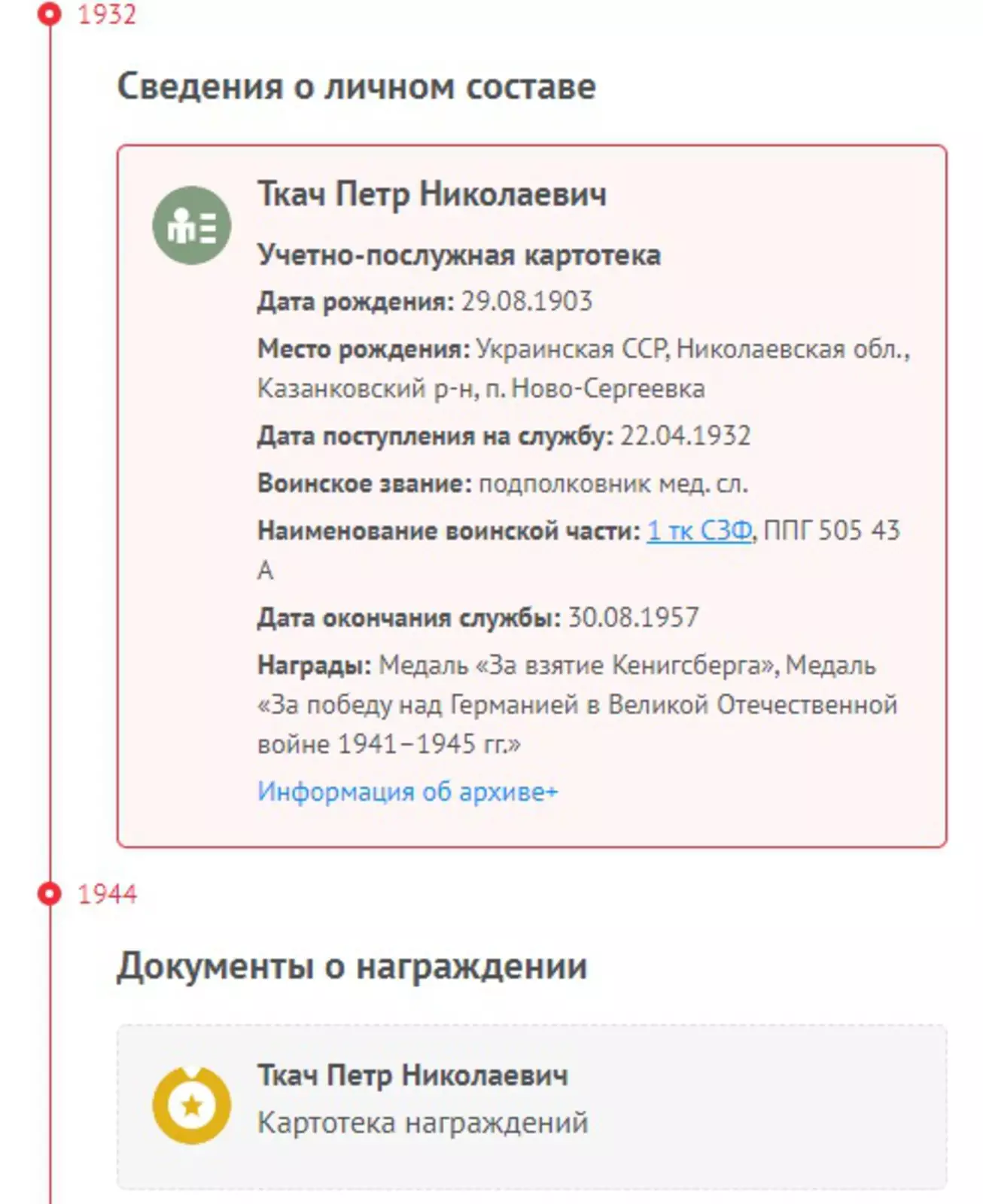 По данным «Памяти народа», офицер медслужбы Петр Ткач действительно воевал в Восточной Пруссии и был награжден медалью «За взятие Кенигсберга».