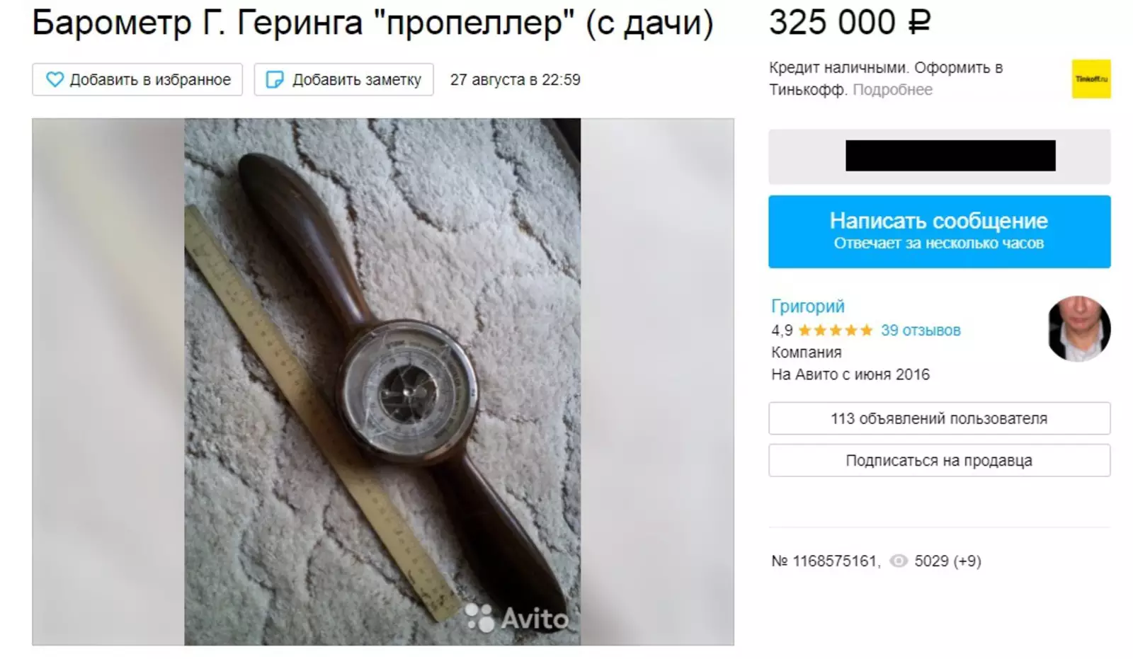 «Трофей»: москвич продает «барометр Геринга» за 325 тысяч рублей