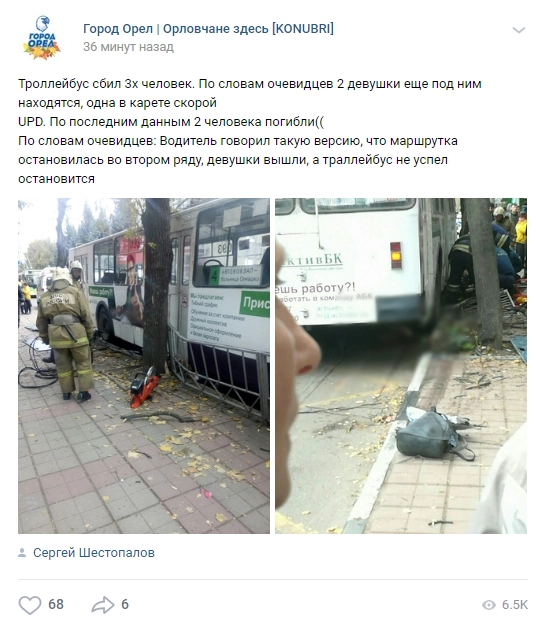 В Орле троллейбус наехал на остановку, в результате чего три человека погибли и двое ранены.