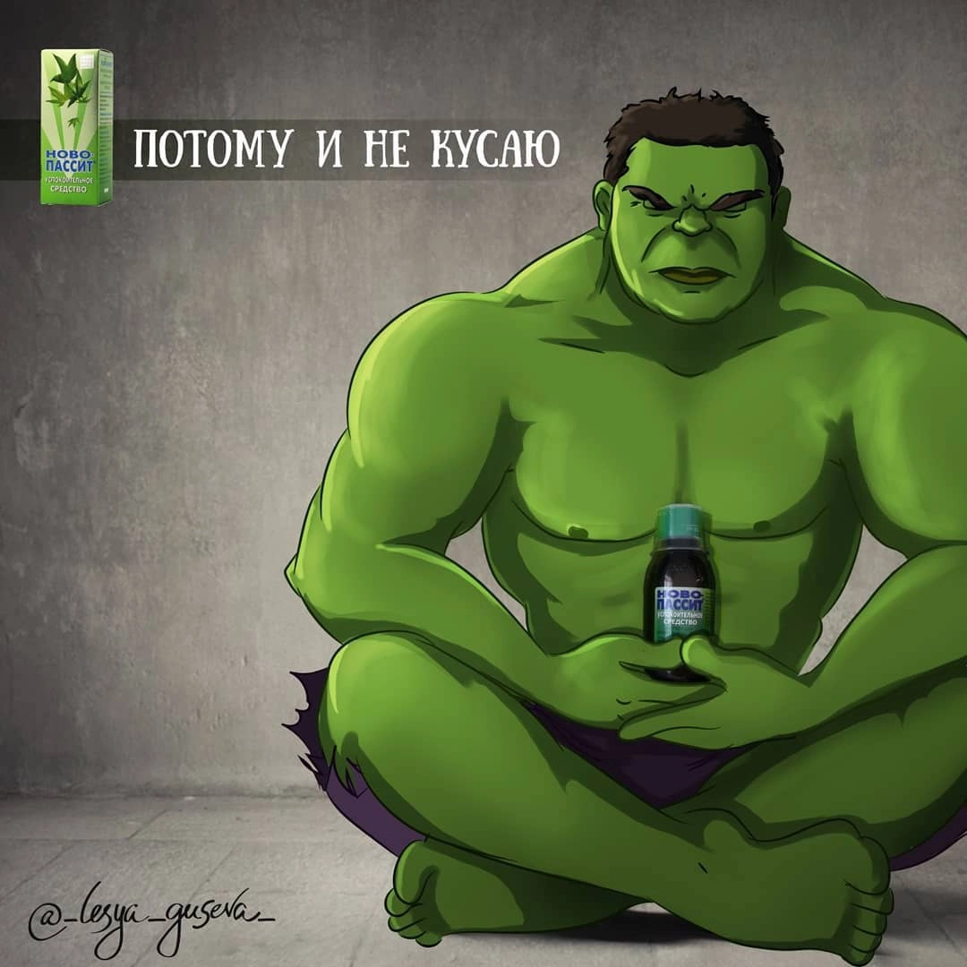 «Мне кажется „Новопассит“ бы только выиграл, если лицом (или, как сейчас модно говорить, амбассадором) своей марки выбрал Халка 😂 Продажи бы просто взлетели».