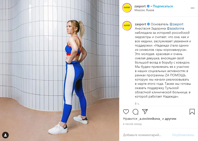 Медсестра Тульской областной клинической больницы Надежда Жукова, прогремевшая на всю Россию своими фотографиями в защитном костюме и купальнике, стала рекламным лицом отечественного бренда одежды ZASPORT.