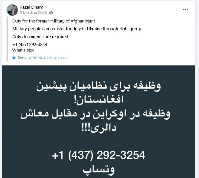 О том, что активная кампания по вербовке афганцев действительно проводилась, свидетельствует и приложенное ниже объявление, в котором некий Фазал Эльхам призывает афганцев отправиться на Украину.