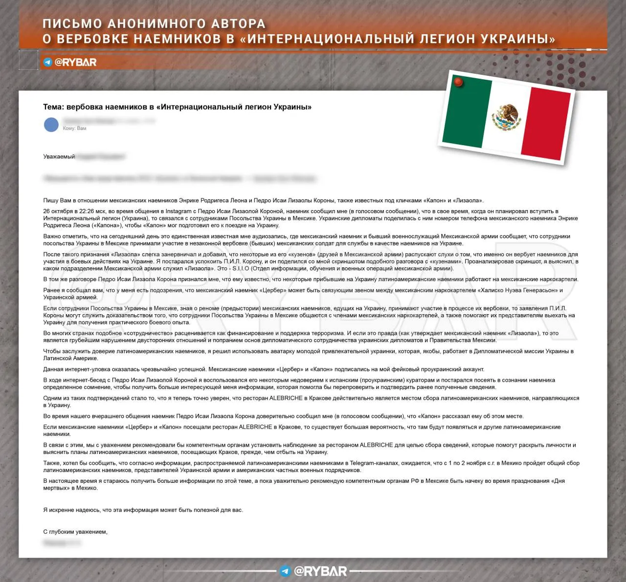 В частности, Telegram-канал «Рыбарь» публиковал письмо жителя Мексики, в котором говорилось, что дипмиссия Украины активно занимается вербовкой латиноамериканцев для вступления в ряды Интернационального легиона.