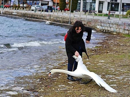 Туристка схватила одного из лебедей, который плавал в водоеме Македонии. После этого девушка потащила его на пляж, чтобы сделать с ним несколько фотографий.