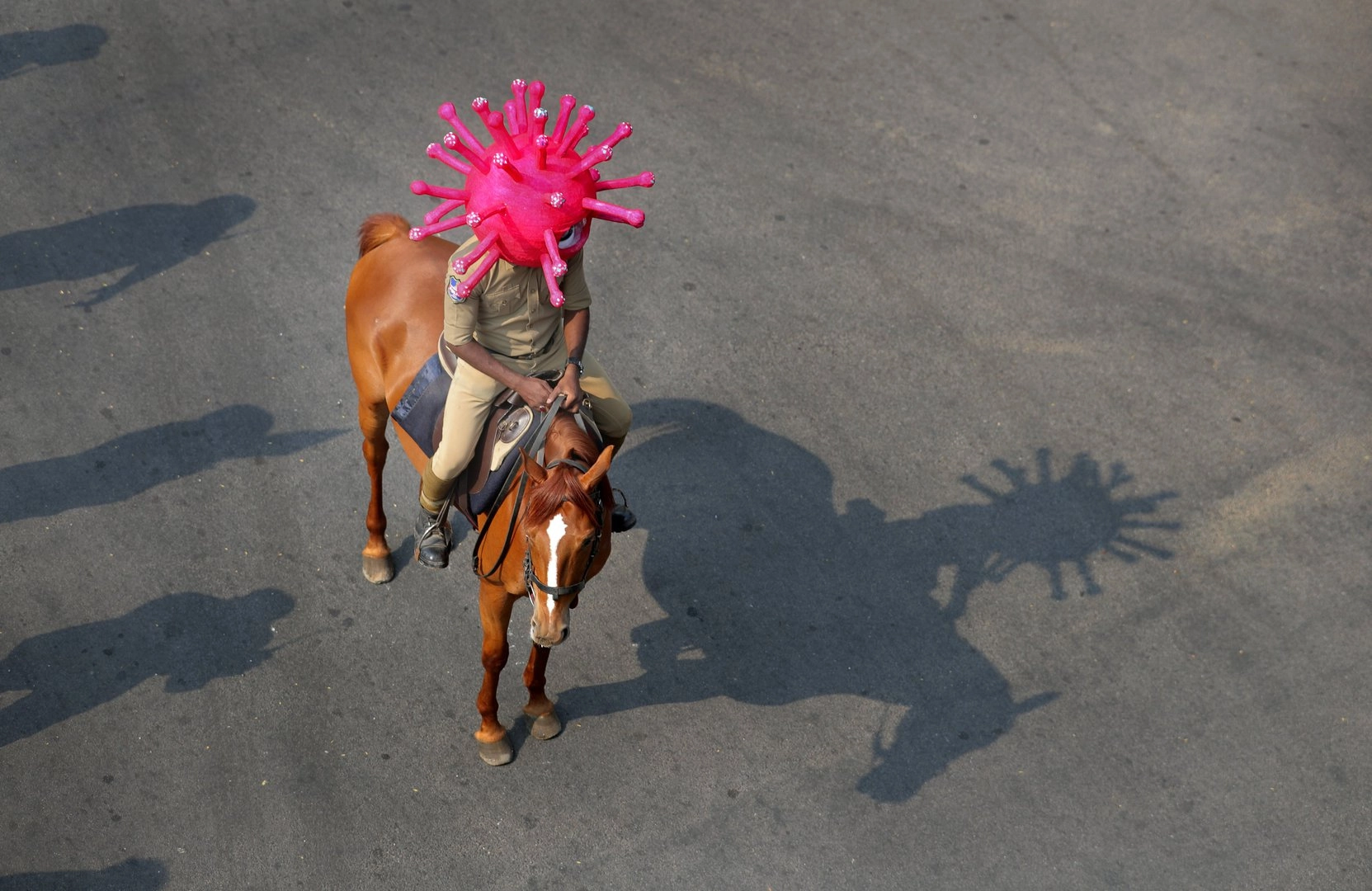 Индийская полиция богата на выдумку в плане необычных методов, побуждающих людей оставаться дома. Ради предотвращения распространения смертельной болезни, сотрудники правопорядка даже начали носить шлемы, напоминающие коронавирус.