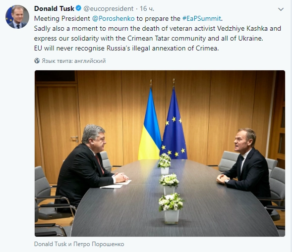 «ЕС никогда не признает незаконную российскую аннексию Крыма», — написал Туск в своем микроблоге в Twitter.