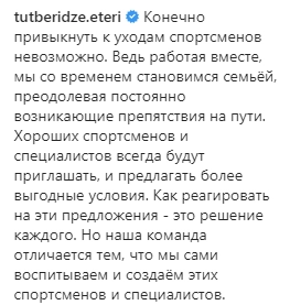 Хороших спортсменов и специалистов всегда будут приглашать, и предлагать более выгодные условия. Как реагировать на эти предложения — это решение каждого. Но наша команда отличается тем, что мы сами воспитываем и создаеем этих спортсменов и специалистов, — написала Тутберидзе в своем Instagram-аккаунте.