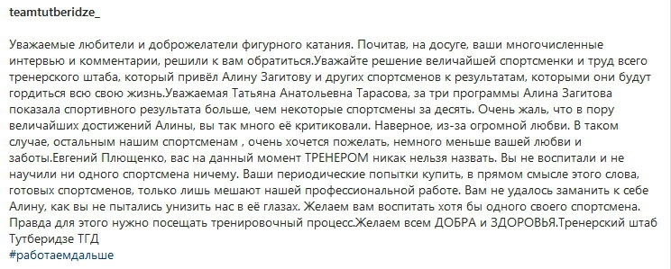 Сегодня в Instagram команды тренера Этери Тутберидзе появился ответ всем поклонникам и недоброжелателям фигуристки, в том числе персональный — Тарасовой и Плющенко.