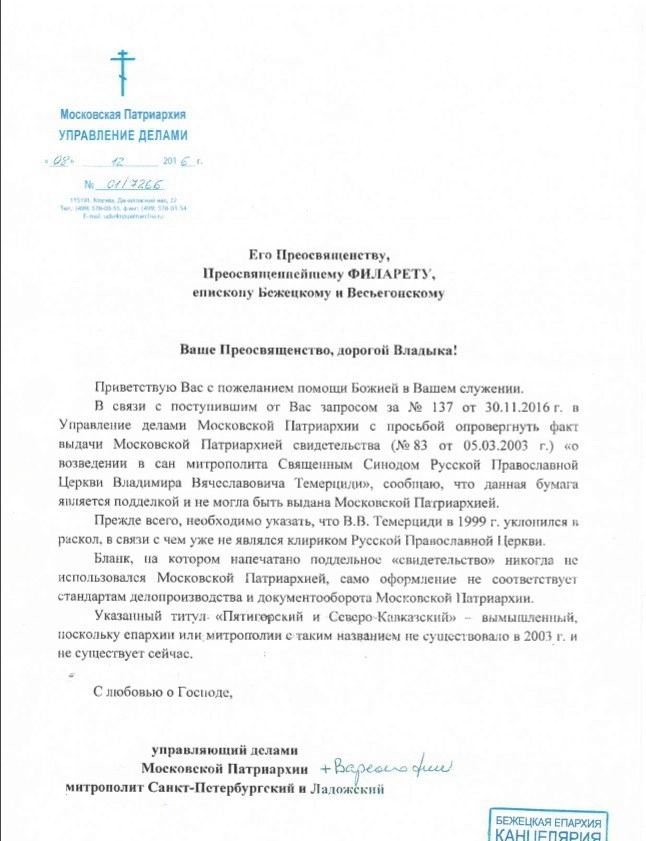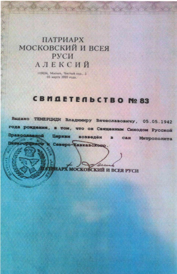 «Прежде всего, необходимо указать, что В. В. Темерциди в 1999 году уклонился в раскол, в связи с чем уже не является клириком Русской Православной Церкви. Бланк, на котором напечатано поддельное „свидетельство“, никогда не использовался Московской Патриархией, само оформление не соответствует стандартам делопроизводства и документооборота Московской Патриархии. Указанный титул — „Пятигорский и Северо-Кавказский“ — вымышленный, поскольку епархии или митрополии не существовало в 2003 году и не существует сейчас», — говорится в письме управделами Московской патриархии.