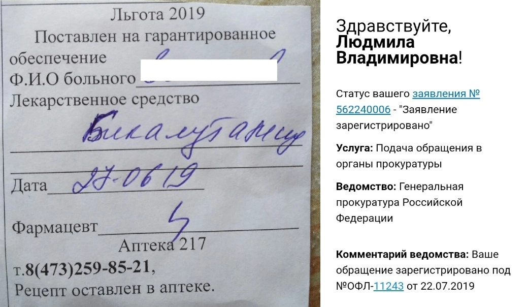 К «Ридусу» обратилась жительница Воронежа Людмила Пылева, которая рассказала, что ее больному раком отцу никак не удавалось получить бесплатные лекарства. Диагноз пожилого мужчины — аденокарцинома предстательной железы третьей стадии, он нуждался в препарате «Бикалутамид». Рецепт был отдан в аптеку 27 июня, но лекарство не выдавали месяц.