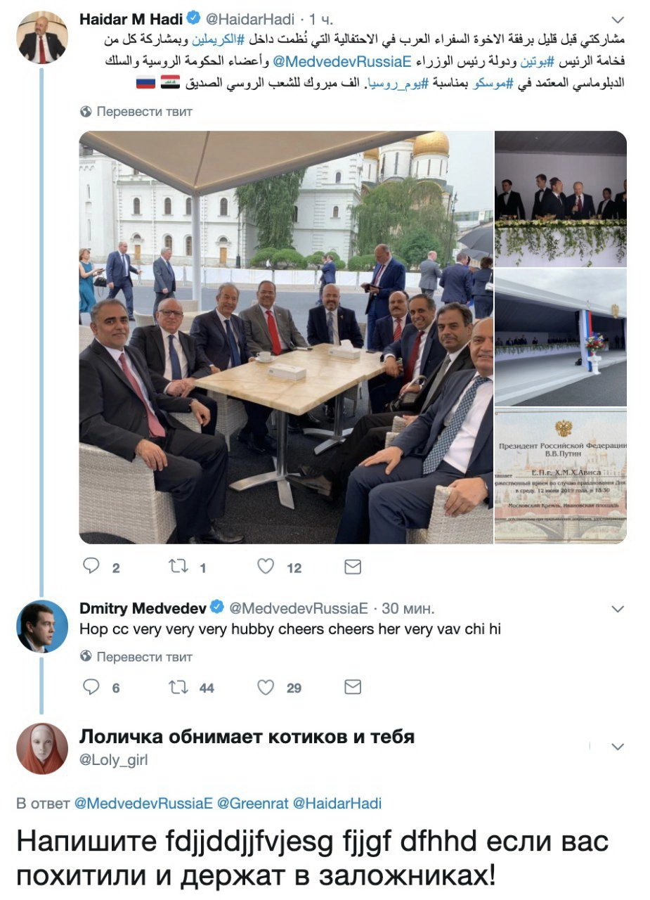 Появившиеся записи — «ответы» от имени Медведева в твиттере посла Ирака в России Хайдара Хади. Это бессмысленный набор слов и символов на латинице. В первом твите почему-то есть слово cucumber (огурец).