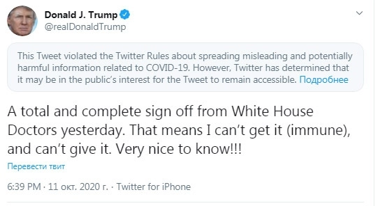 «Потенциально опасной информацией о COVID-19» сочли в Twitter запись президента Соединенных Штатов Дональда Трампа об иммунитете к коронавирусу. Она не удалена, но помечена специальным комментарием администрации социальной сети.