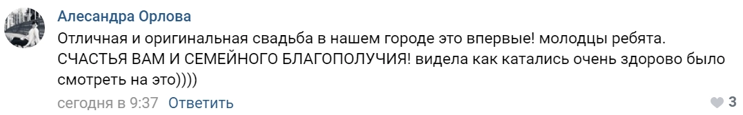 Эти кадры были сделаны в городе Вичуга Ивановской области 9 августа и опубликованы в соцсети «ВКонтакте». В этом ролике можно увидеть, как украшенные большегрузы колонной едут по улице. Из одного из них выходит невеста — Юлия Гусарова.