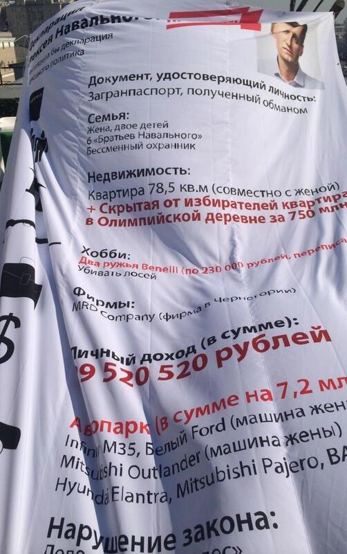 Баннер составлен в качестве биографической справки. Факты в ней указаны такие: документ, удостоверяющий личность – загранпаспорт, полученный обманом; недвижимость – скрытая от избирателей комфортная квартира в Олимпийской деревне. В графе «хобби» указано: «убивать лосей из ружей Benelli (по 230 тысяч рублей, переписал на жену)».