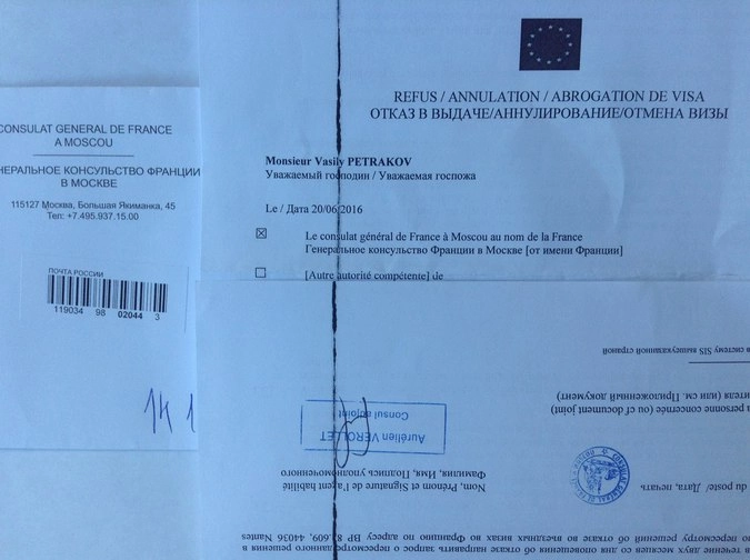 А еще через несколько дней Петраков получил «письмо счастья» из Генерального консульства Франции в Москве, в котором его известили об отмене пятилетней французской визы, что была у него.