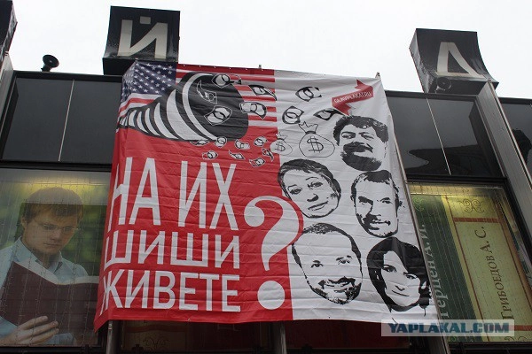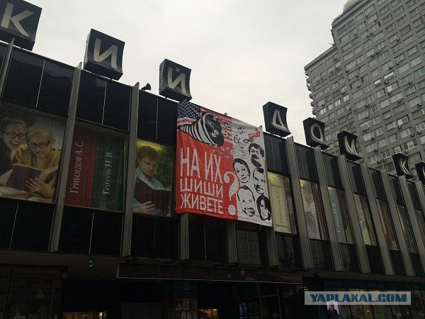 «На их шиши живете?» - вопрошает сатирика Шендеровича, писателя Быкова, певца ртом перед солдатами хунты Макаревича, Дианы Арбениной и их коллег по русофобии плакат, размещенный на Московском доме книги.