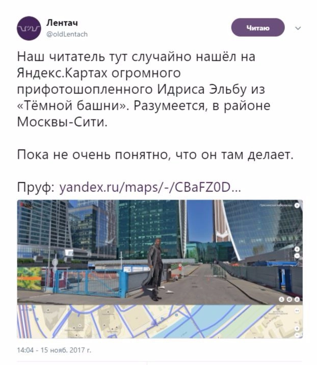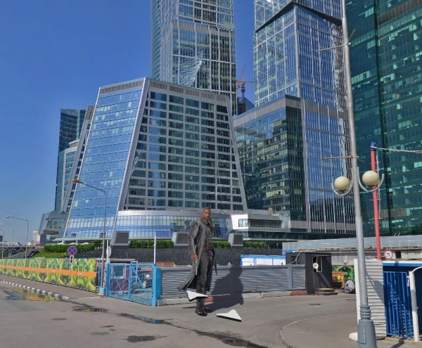 На панораме сервиса «Яндекс.Карты» неожиданно появился высокий темнокожий мужчина с пистолетом в руке, стоящий на фоне зданий комплекса «Москва-Сити».