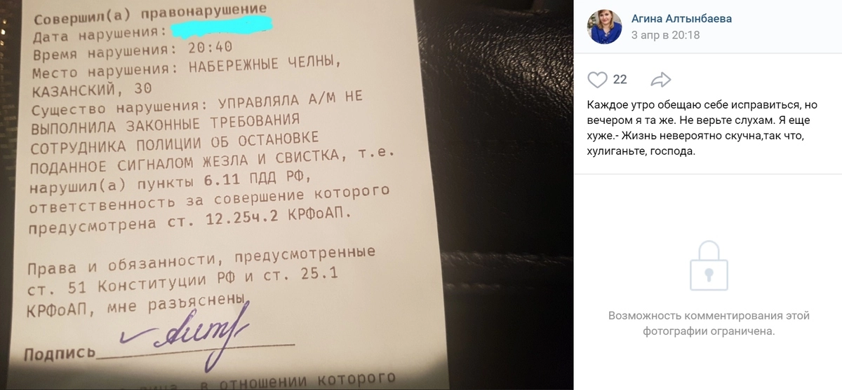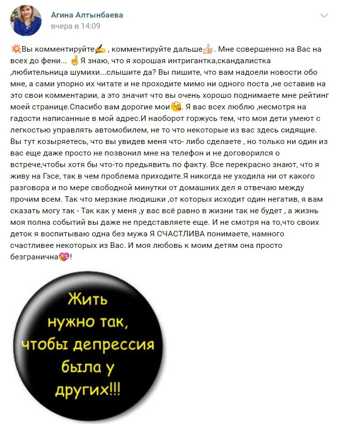 Судя по странице Агины Алтынбаевой, всего у 29-летней женщины четверо детей — старшим сыновьям по девять лет, а младшему — девять месяцев. Про себя она пишет, что не замужем, находится в декретном отпуске, в людях ценит доброту и честность, является очень деятельным человеком и очень любит своих сыновей. Примечательно, что на ее странице было фото в форме инспектора ДПС. Также она уже выкладывала фотографию штрафа с надписью «хулиганьте, господа».