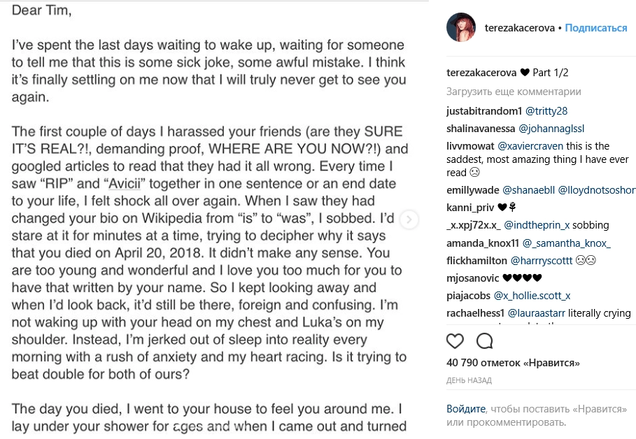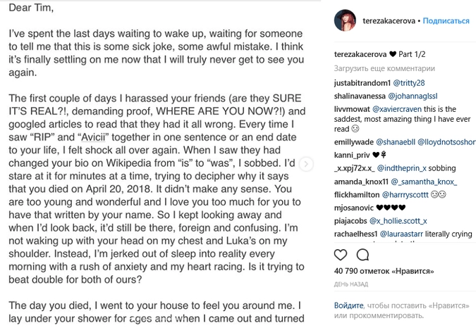 Одна из бывших девушек скончавшегося в прошлую пятницу популярного шведского диджея Тима Берглинга, более известного под сценическим именем Авичи, опубликовала письмо к нему в своем аккаунте в Instagram.