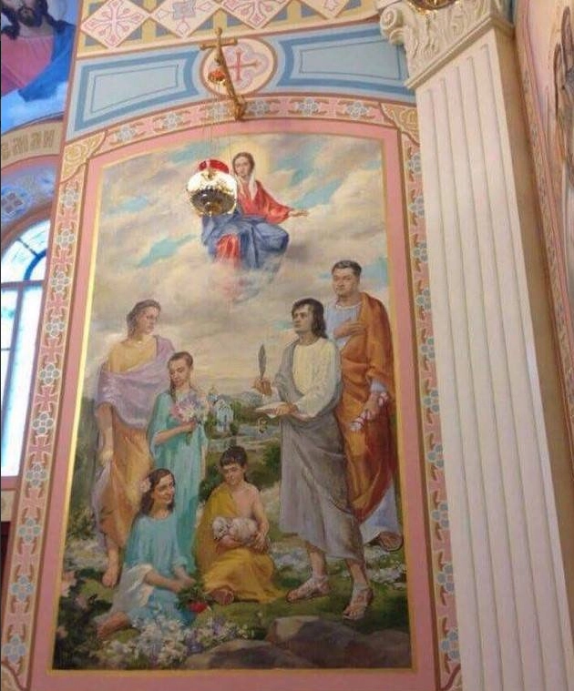 В имении нынешнего лидера Петра Порошенко также имеется церквушка, главный экспонат которой — фреска с изображением самого Петра Алексеевича и членов его семьи.