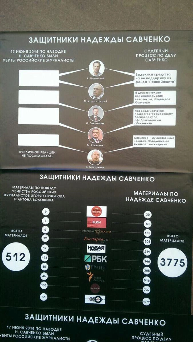 Как рассказали сотрудники одного из изданий, утром 15 марта на стенах они увидели расклеенные плакаты, на которых была изображена инфографика с цифрами, отражающими количество публикаций по поводу убийства российских журналистов Игоря Корнелюка и Антона Волошина и публикаций в поддержку Надежды Савченко. Об убийстве журналистов, как утверждают авторы плакатов, вышло 512 публикаций, в то время как о Надежде Савченко было опубликовано 3 775 статей.