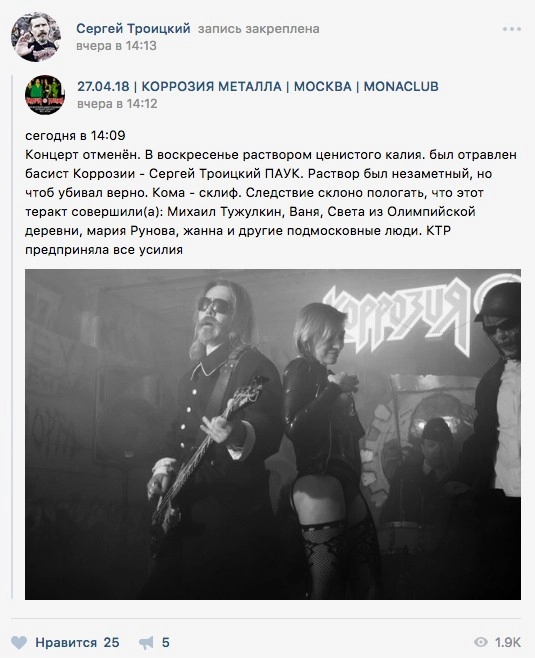 Ранее на странице Сергея Троицкого в соцсети «ВКонтакте» и на официальной странице группы «Коррозия металла» появилось сообщение, что концерт, назначенный на 27 апреля, будет отменен по причине отравления Паука раствором цианистого калия.