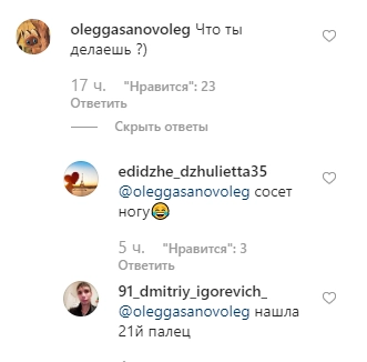 На снимке Лобода держит руками свою правую ногу и собирается облизать ее языком. Черные открытые босоножки на шпильке дают прекрасный обзор на шесть пальцев на ноге. «А почему шесть пальцев на ноге?», «Шесть пальцев на ноге — это так надо было?» — наперебой спрашивают друг друга фанаты творчества певицы.