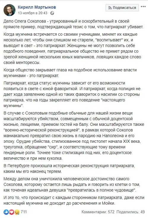 Бывший пресс-секретарь Росмолодежи экс-координатор либерального клуба «Единой России» главный редактор нежелательной в РФ организации «Новая газета Европа» иноагент Кирилл Мартынов в своих социальных медиа обвинил в случившемся с жертвой Соколова патриархальный порядок в обществе.