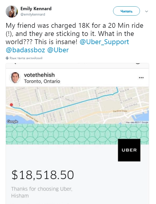 Житель Канады вызвал такси по приложению Uber и заплатил за 20-минутную поездку 18 518 канадских долларов (850 тысяч рублей. — Прим «Ридуса»).