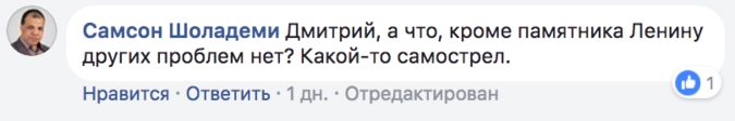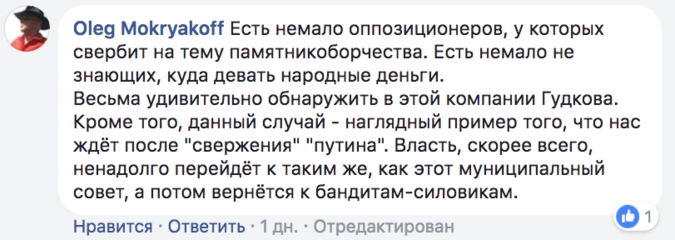 «Тема для референдума выбрана хорошая, громкая: отправить в утиль, то есть в „Музеон“, памятник Ленину с Калужской, она же Октябрьская, площадь, — написал Гудков в Facebook. — Помните — это такая уродливая советская статуя на огромном постаменте? Кстати, я не знал, почему она там стоит, а история удивительная: неподалеку в „вождя мирового пролетариата“ стреляла Фанни Каплан. Нынешний памятник водружен в 1985 году, что во многом и объясняет его уродство: впрочем, речь не о моих эстетических пристрастиях, а о том, что историко-культурной ценности он уже в силу этого не представляет».