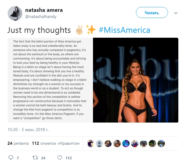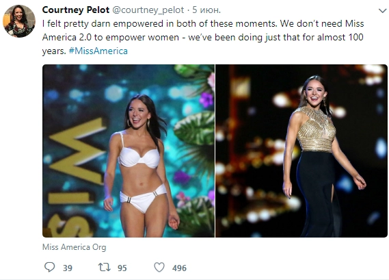 «Я чувствовала себя одинаково раскрепощенно в обоих этих ситуациях, — подчеркнула она, приложив свои фотографии в бикини и вечернем наряде. — Мы не видим необходимости в „Мисс Америка 2.0“, повышающем авторитет женщин, — мы и так занимались этим почти 100 лет».