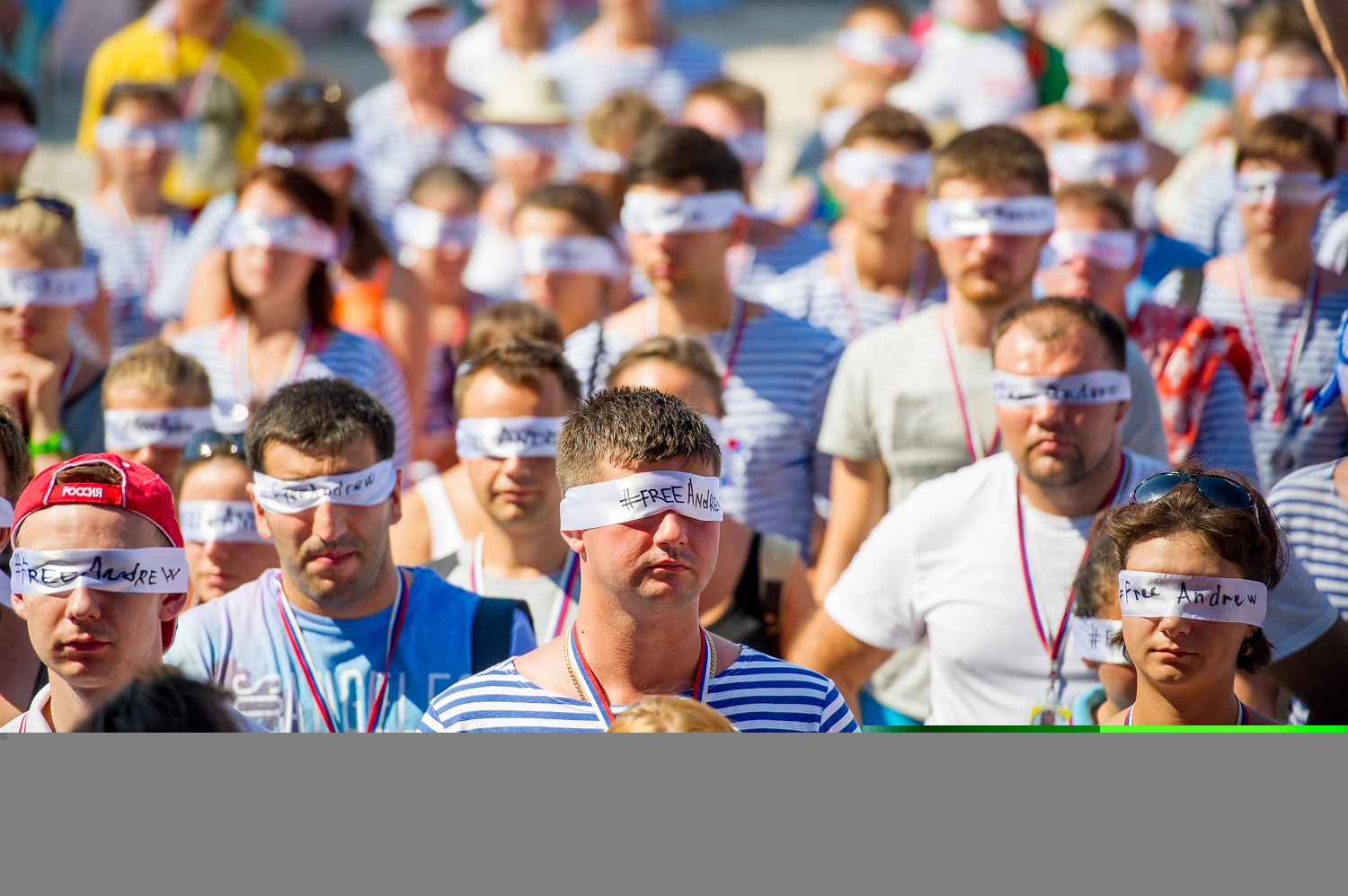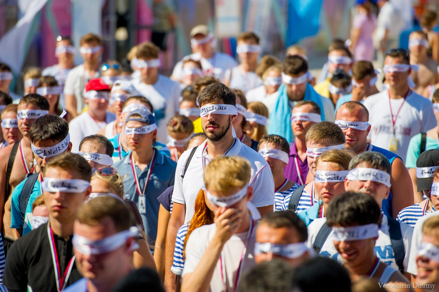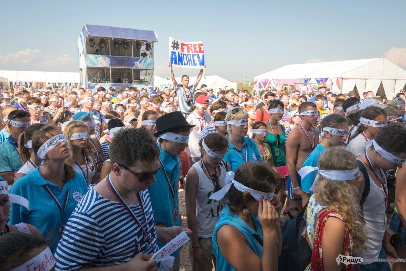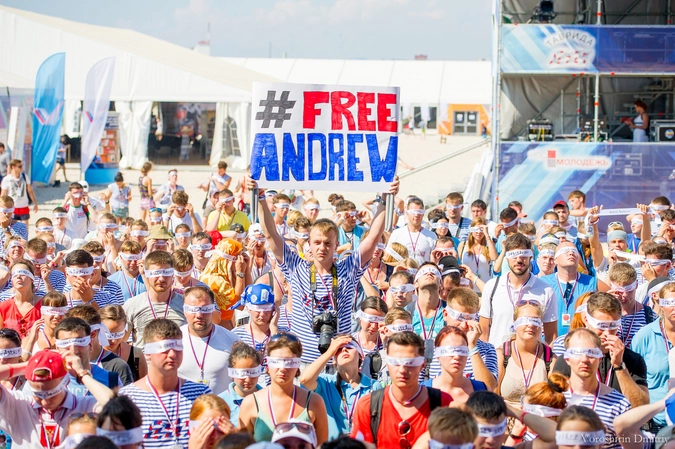 Более тысячи форумчан из разных городов России вышли на площадь перед главной сценой форума, скандируя «Освободите Андрея!» Участники историко-патриотического форума надели на глаза повязки с надписью #FreeAndrew, общепринятого хэштега акций в поддержку российского журналиста.