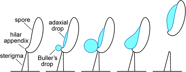 Отмечается, что напитавшиеся влагой споры избавляются от нее через особое отверстие, выделяя так называемую каплю Буллера. Параллельно поверхность споры также покрывается конденсирующейся из воздуха влагой.