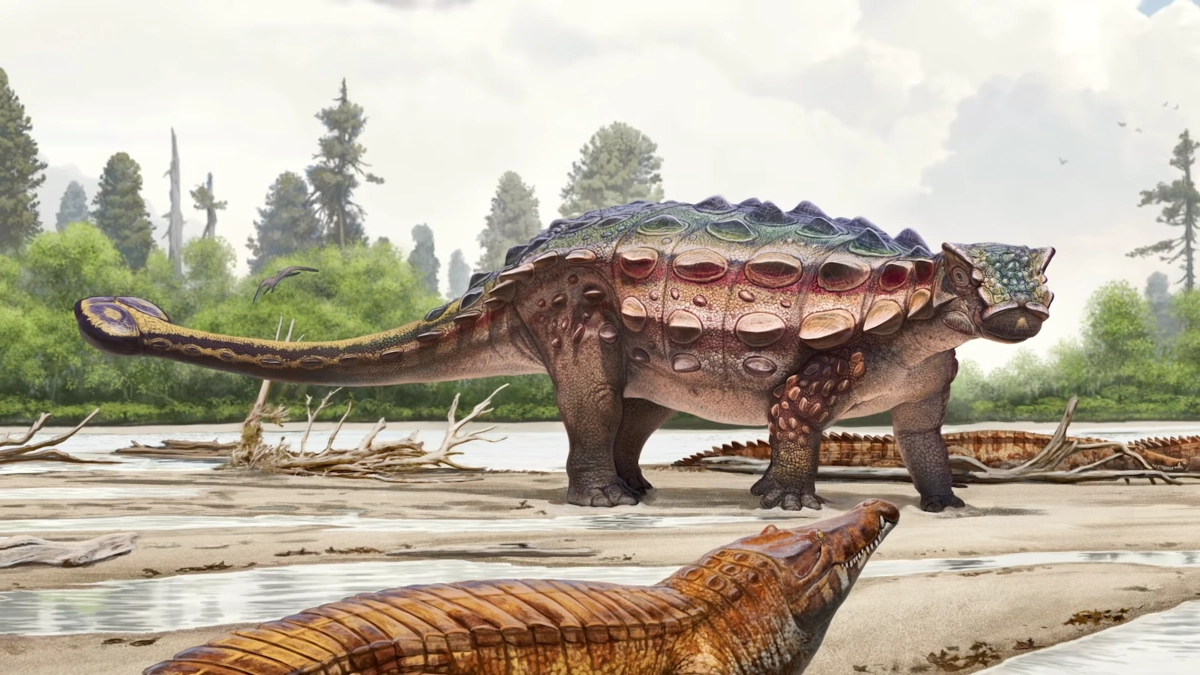 Художники уже представили первые реконструкции динозавра, по которым видно, что череп анкилозаврида покрывают рога и шипы, расположенные у переносицы. Такая броня помогает животному защищаться от хищников.