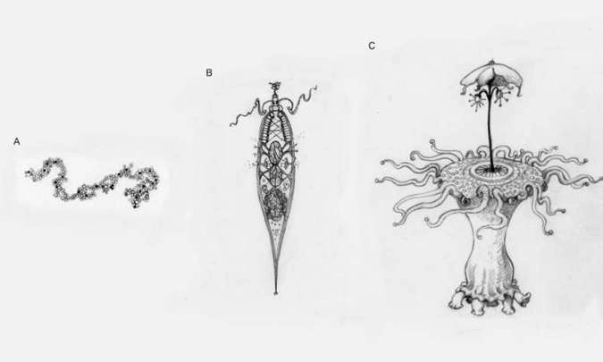 Авторы представили ряд возможных видов инопланетян, которые находятся на разных уровнях развития. Изображение «А» представляет простую реплицирующуюся молекулу, без видимой конструкции, которая может как участвовать, так и не участвовать в естественном отборе.