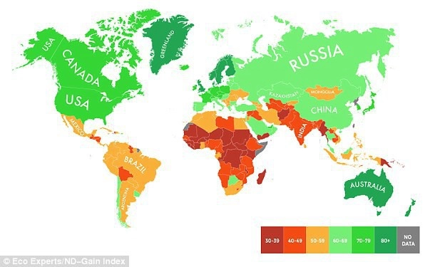 Кроме того, эксперты разработали карту, показывающую готовность разных стран справиться с последствиями изменения климата. На карте 192 страны распределены по баллам от 0 — «уязвимости» до 100 — «готовности».