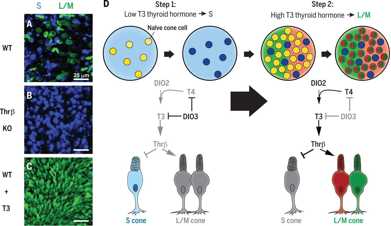 В ходе работы специалисты узнали, что у позвоночных животных и человека важнейшую роль на процессы формирования клеток сетчатки играют тиреоидные гормоны щитовидной железы и в частности трийодтиронин.